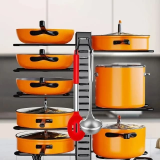 Our Upgraded Cookware Set Organization Rack Makes Your Pot And Lid Storage More Convenient, And Your Kitchen Will Be Clean And Tidy. Pot Racks & Organizers:The Pot And Pan Organizer Helps You Store Pots, Pans, Lids, Cutting Boards And Other Kitchen Utensils More Conveniently, Adjustable Bake Ware Rack, Cookie Sheet Baking Pan And Tray Organizer For Kitchen Cabinet And Pantry Storage Making Your Kitchen Neat And Organized. This 8-Tier Cookware Storage Organizer Rack For Kitchen Is An Adjustable Organizer. You Can Adjust The Height Of Each Tier To Accommodate Pots And Pans Of Different Heights. This Sturdy Pot Rack Is Made Of Heavy-Duty, High-Quality Iron With A Black Painted Finish That Gives It Enhanced Rust Resistance For Extended Use. The Versatility Of This Cabinet Pots And Pans Organizer Is That You Can Make It Stand Up Or Let It Lie Down. This Increases The Number Of Places And Ways You Can Store Your Pots And Pans. Adjustable Bakeware Organizer Pot Lid Holder Rack for Pots,Kitchen Storage & Organization!