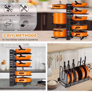 【Adjustable Tiers】This pan rack organizer comes with 8 adjustable tiers, you can install the pan organizer according to the size of your pots and pans. No matter how big your pot is, it can still fit into your pot organizer. Help you more convenient to organize kitchen storage.
