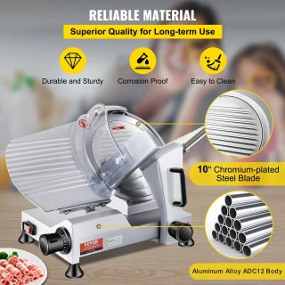 The food slicer machine is made of cast aluminum, and the 10-inch diameter blade is built with 45 # carbon steel. The sharp edge of the blade allows quick meat slicing. The groove cutting surface effectively keeps the meat from remaining on the blade.